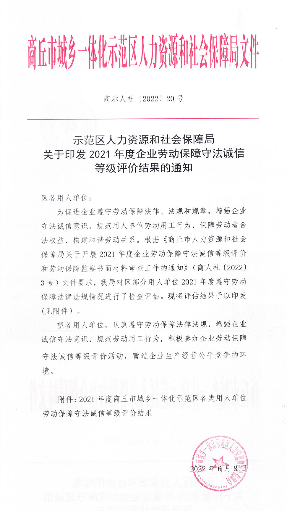 近日,商丘市示范區(qū)人力資源和社會(huì)保障局公布了《關(guān)于2021年度商丘市城鄉(xiāng)一體化示范區(qū)各類用人單位勞動(dòng)保障守法誠(chéng)信等級(jí)評(píng)價(jià)結(jié)果》,我公司再次被評(píng)為示范區(qū)勞動(dòng)保障守法誠(chéng)信A級(jí)示范單位,這一榮譽(yù)充分表明了勞動(dòng)保障部門對(duì)公司勞動(dòng)管理規(guī)范與員工權(quán)益保障等方面工作的充分肯定。